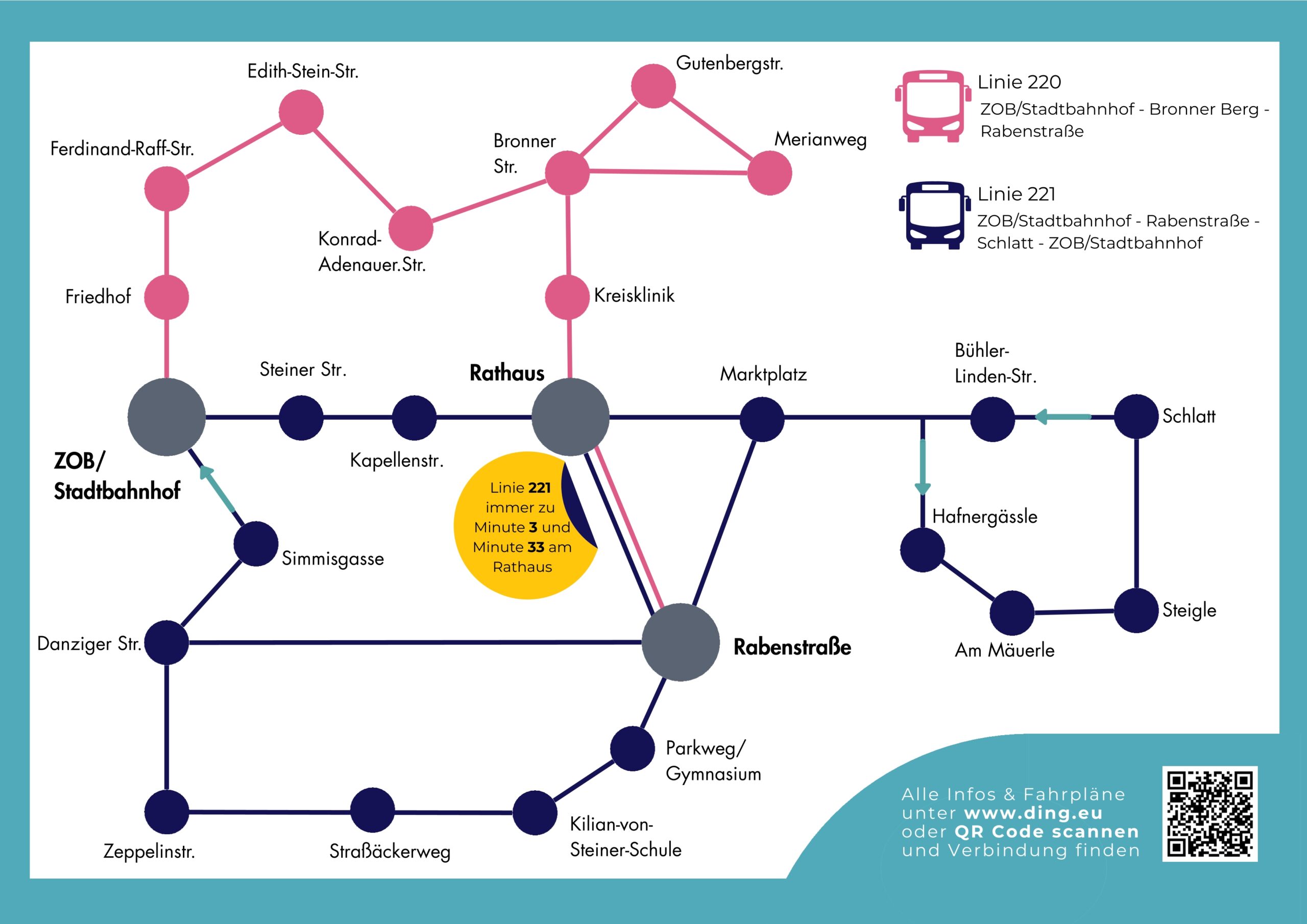 Die Linien 220 und 221 verbinden im Halbstundentakt die Kernstadt, wichtige Schulstandorte, Einkaufsmöglichkeiten und den ZOB/Stadtbahnhof, von früh bis in die Abendstunden (letzte Fahrt der Linie 220 und 221 ca. 22 Uhr).